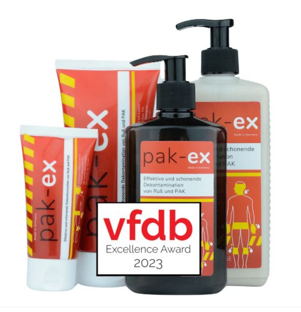 Il gel ad alte prestazioni pak-ex convince per le sue prestazioni di pulizia rapida ed efficace di oltre il 96% di IPA, fuliggine e altri tipi di sporco, proteggendo allo stesso tempo tutte le aree della pelle senza compromettere la barriera cutanea. Per una pulizia rapida subito dopo l’uso o come detergente completo per la doccia, pak-ex è stato appositamente progettato per soddisfare le esigenze dei vigili del fuoco e degli specialisti del settore. Il gel ad alte prestazioni brevettato da Dermapurge sfrutta il potere dei minerali di argilla, che agiscono come un magnete, legando IPA e fuliggine direttamente alla pelle e prevenendo così il pericoloso e invisibile trasporto della contaminazione. Sia che si tratti di postazioni igieniche fisse con dispenser a pompa o di postazioni mobili in tubo compatto, pak-ex è sempre presente dove protezione e igiene contano.