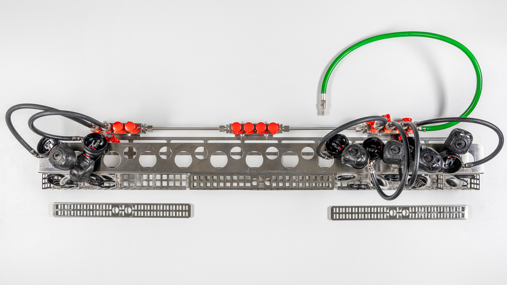 L’inserto per regolatori appositamente sviluppato per il risciacquo di decontaminazione PSA L consente di pulire e disinfettare 12 regolatori, comprese le piccole parti, in un solo ciclo di lavaggio.